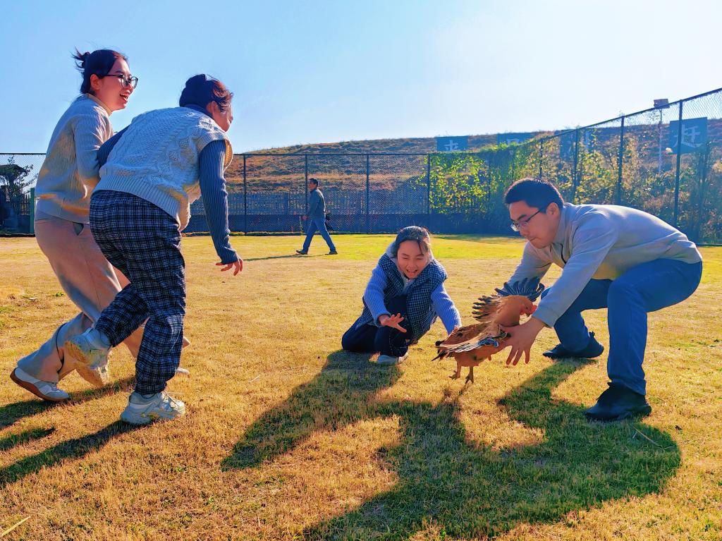 上午9时,运动会在农场绿意盎然的开阔场地正式拉开帷幕。与传统运动会不同,本次活动精心设计了多个兼具趣味性、竞技性与田园特色的比赛项目。其中最受欢迎的莫过于抓鸡比赛——在划定区域内,老师们各显身手,与散养土鸡展开了一场速度与反应的趣味较量。现场欢呼声、笑声与鸡鸣声此起彼伏,成功“擒获”者更能将土鸡作为奖品带回家,体验收获的喜悦。